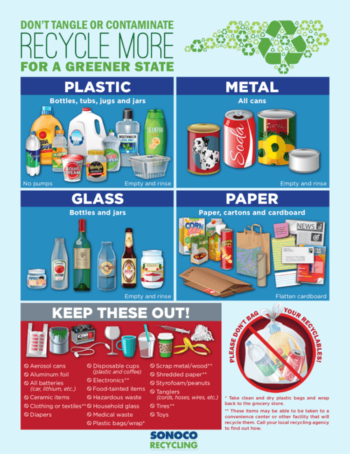 - All plastic, metal, glass, paper, and cardboard should be co-mingled in the same container.